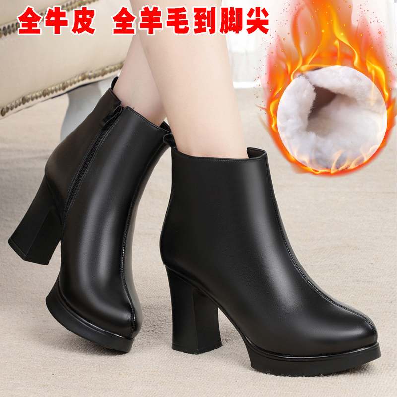 高跟皮鞋真皮女棉鞋冬加绒粗跟单靴棉靴子女短靴走秀鞋厚底工作鞋