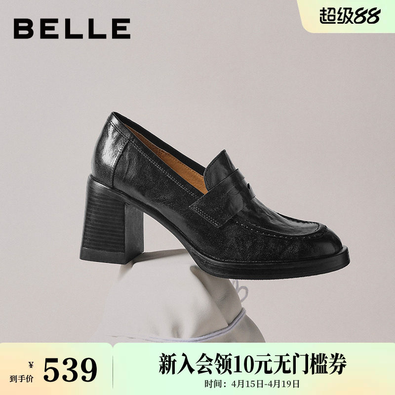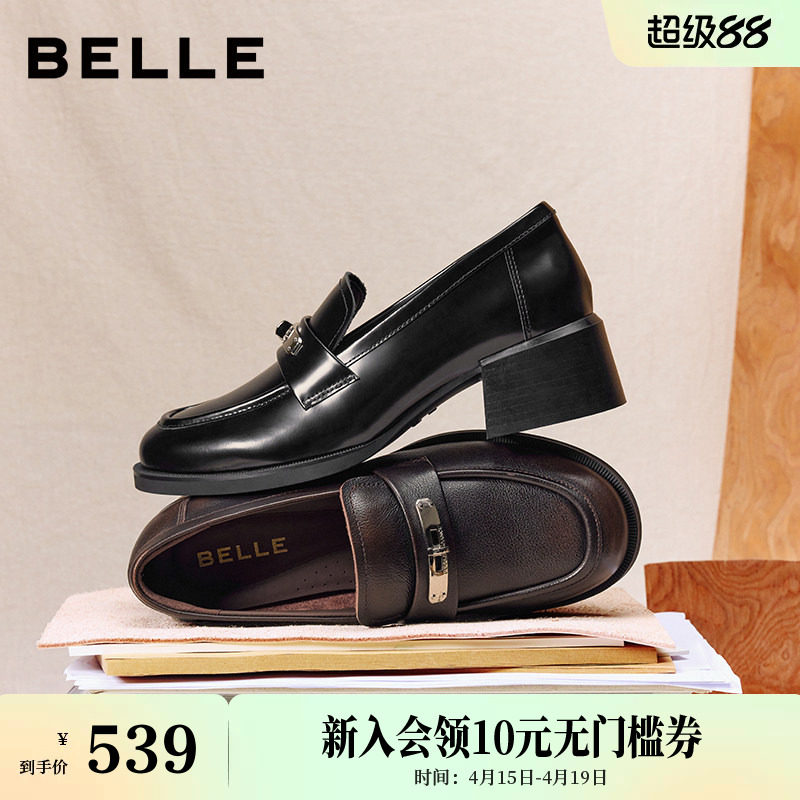 百丽复古粗高跟乐福鞋女26春季新款黑色小皮鞋深口单鞋F2H1DAA6