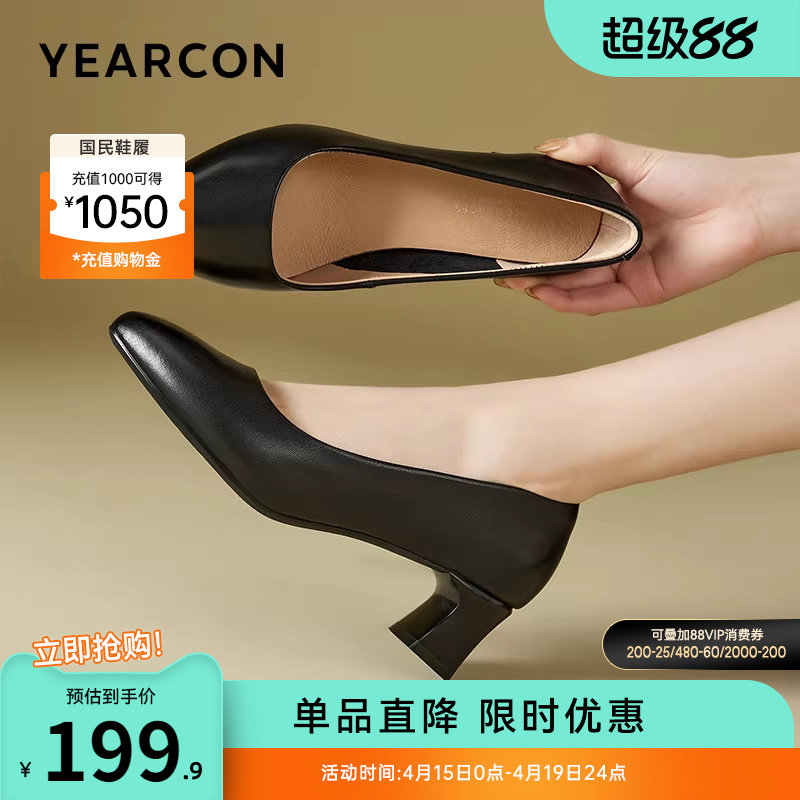 意尔康女鞋黑色单鞋真皮尖头粗跟气质女士职业工作鞋面试高跟皮鞋
