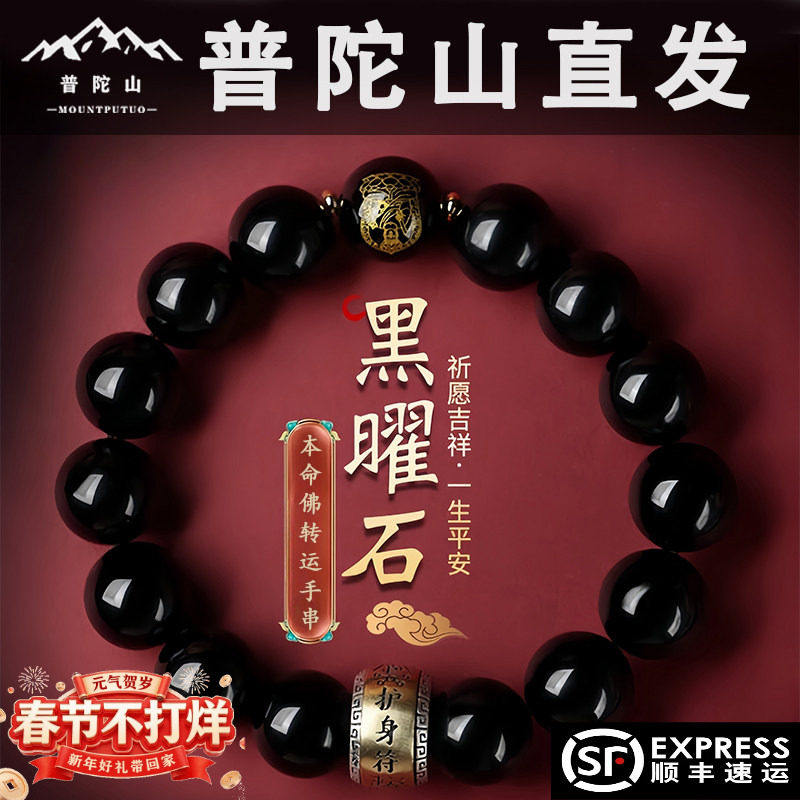 普陀山天然黑曜石手串十二生肖男女手链本命佛守护神情侣手串佛珠
