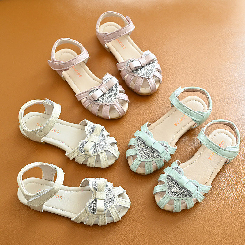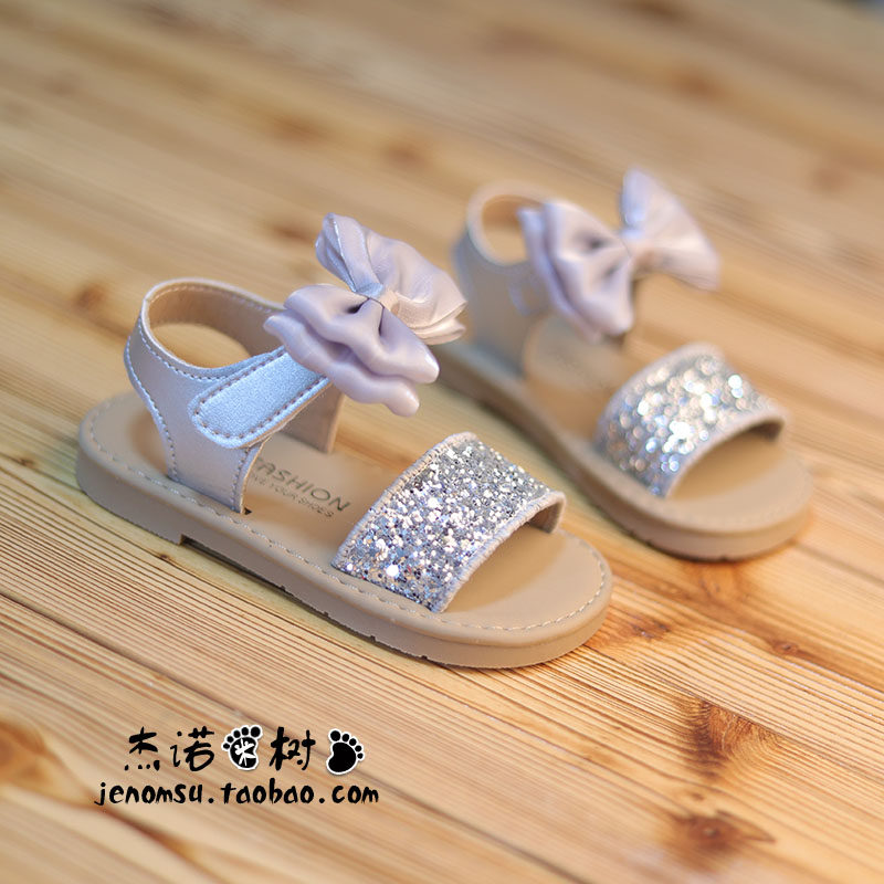 女童凉鞋 中小童魔术贴软底鱼嘴平底沙滩鞋蝴蝶结亮片夏季公主鞋