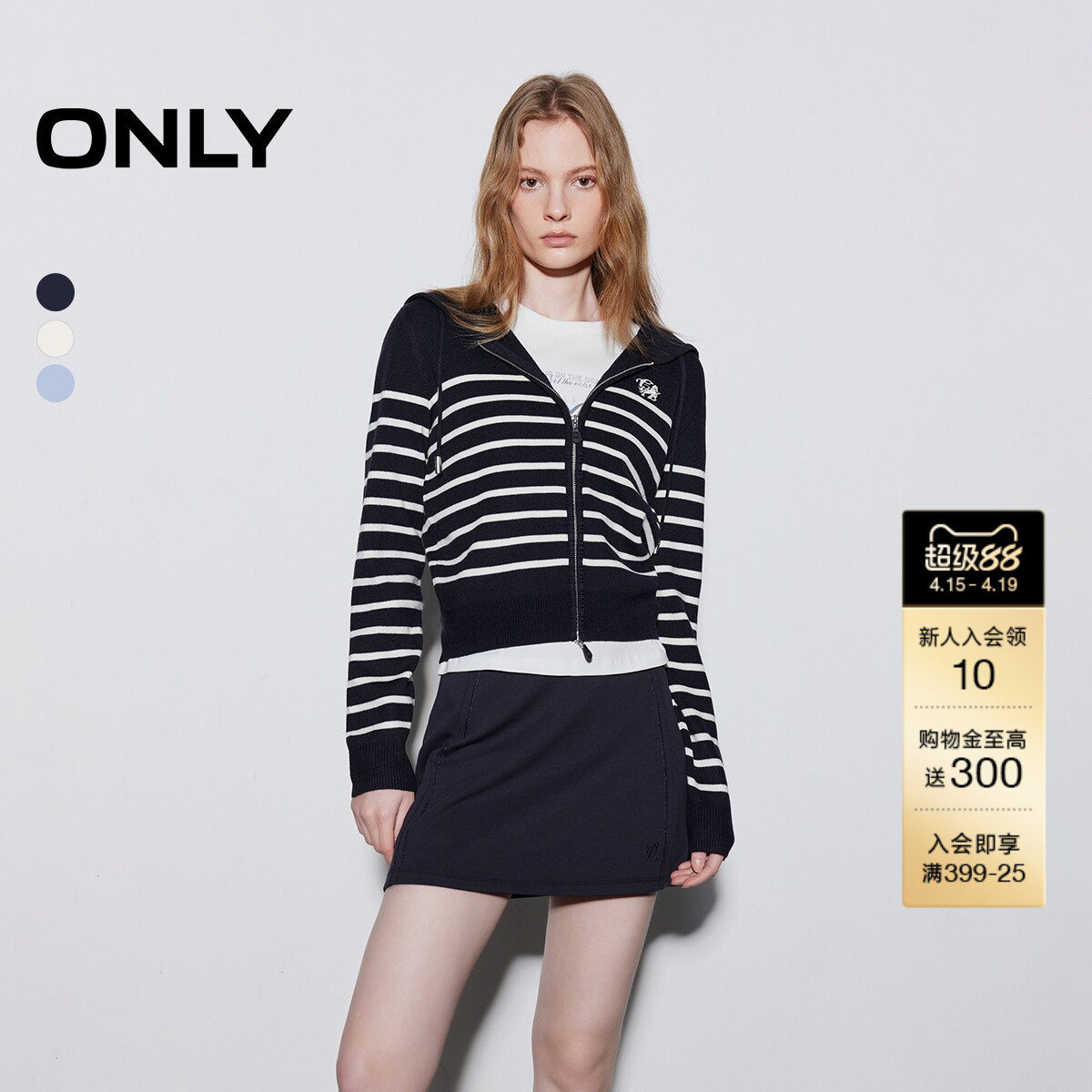 ONLY2026春季新款条纹双向拉链舒适亲肤立体连帽开衫针织衫上衣女