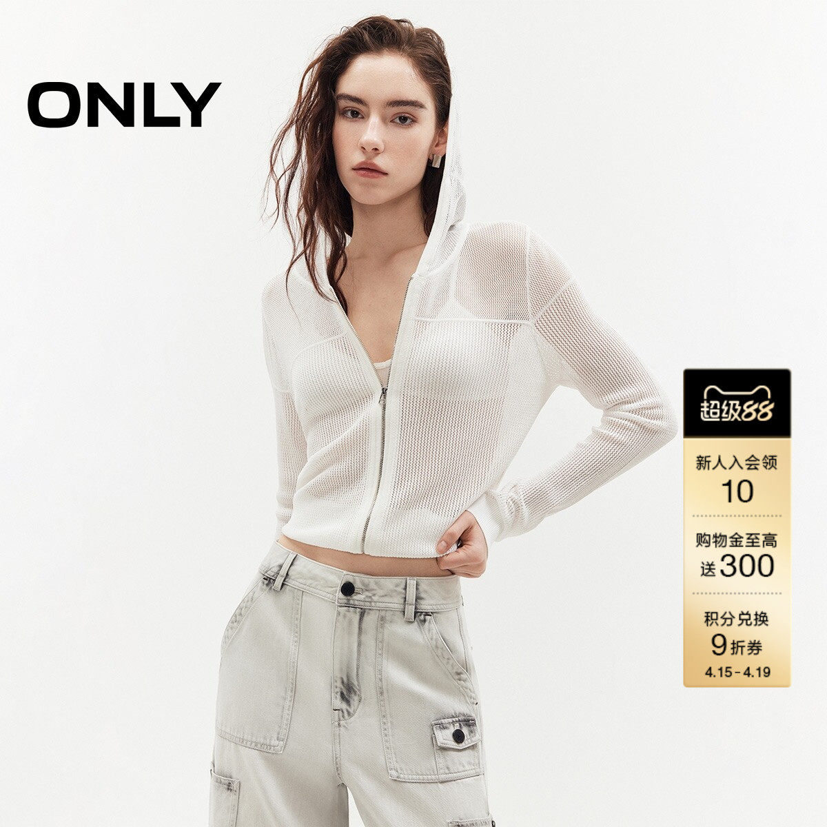ONLY2026夏季新款条纹短款上衣双开拉链网眼连帽镂空开衫针织衫女