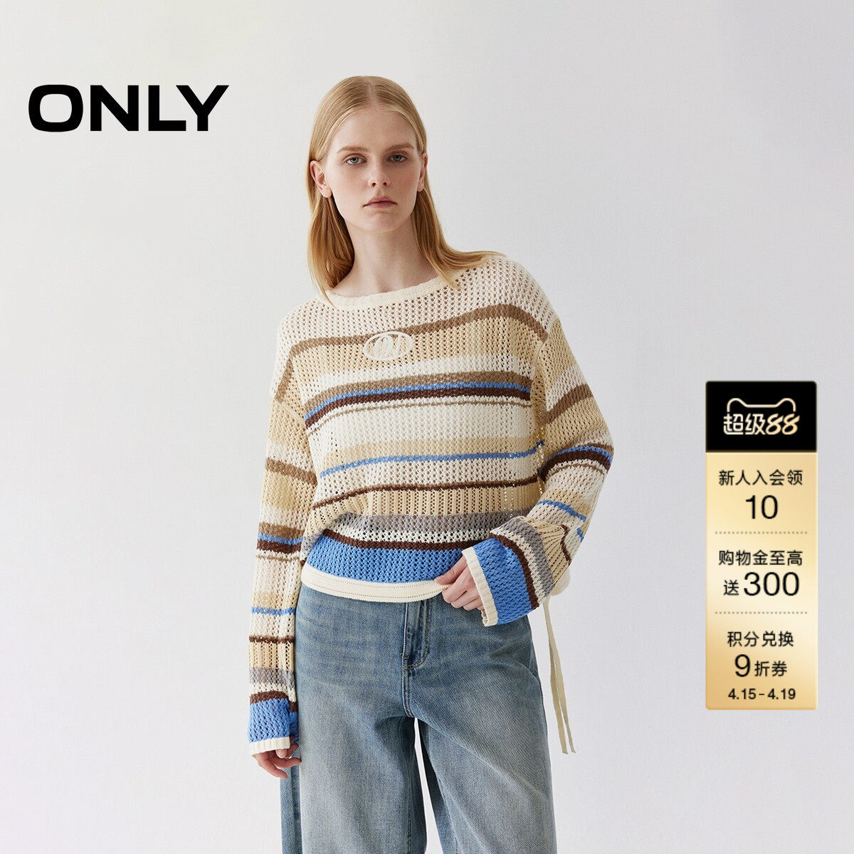 ONLY2026夏季新款双层镂空肌理慵懒圆领宽松落肩条纹针织衫上衣女