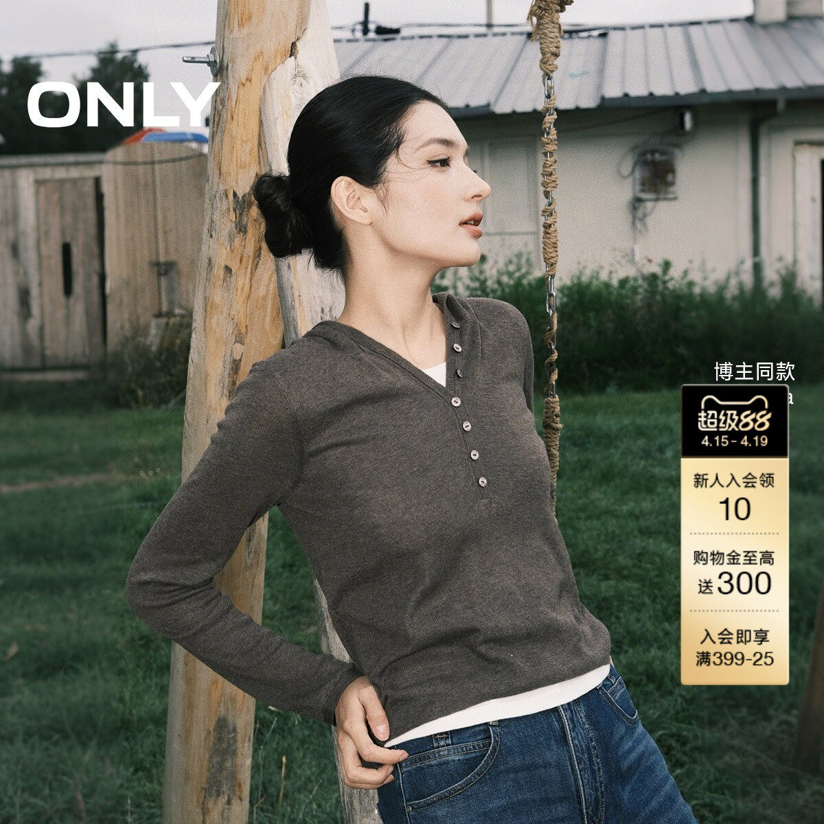 ONLY春季松弛感拼接假两件精致贝母扣饰连帽长袖针织衫上衣女