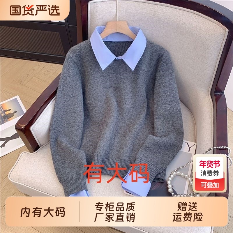2026春季新款大码衬衫领假两件套头毛衣毛衣胖mm学院风内搭针织衫