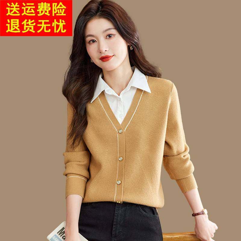 假两件上衣女套头2025春秋新款针织毛衣拼接白色衬衫领显瘦打底衫