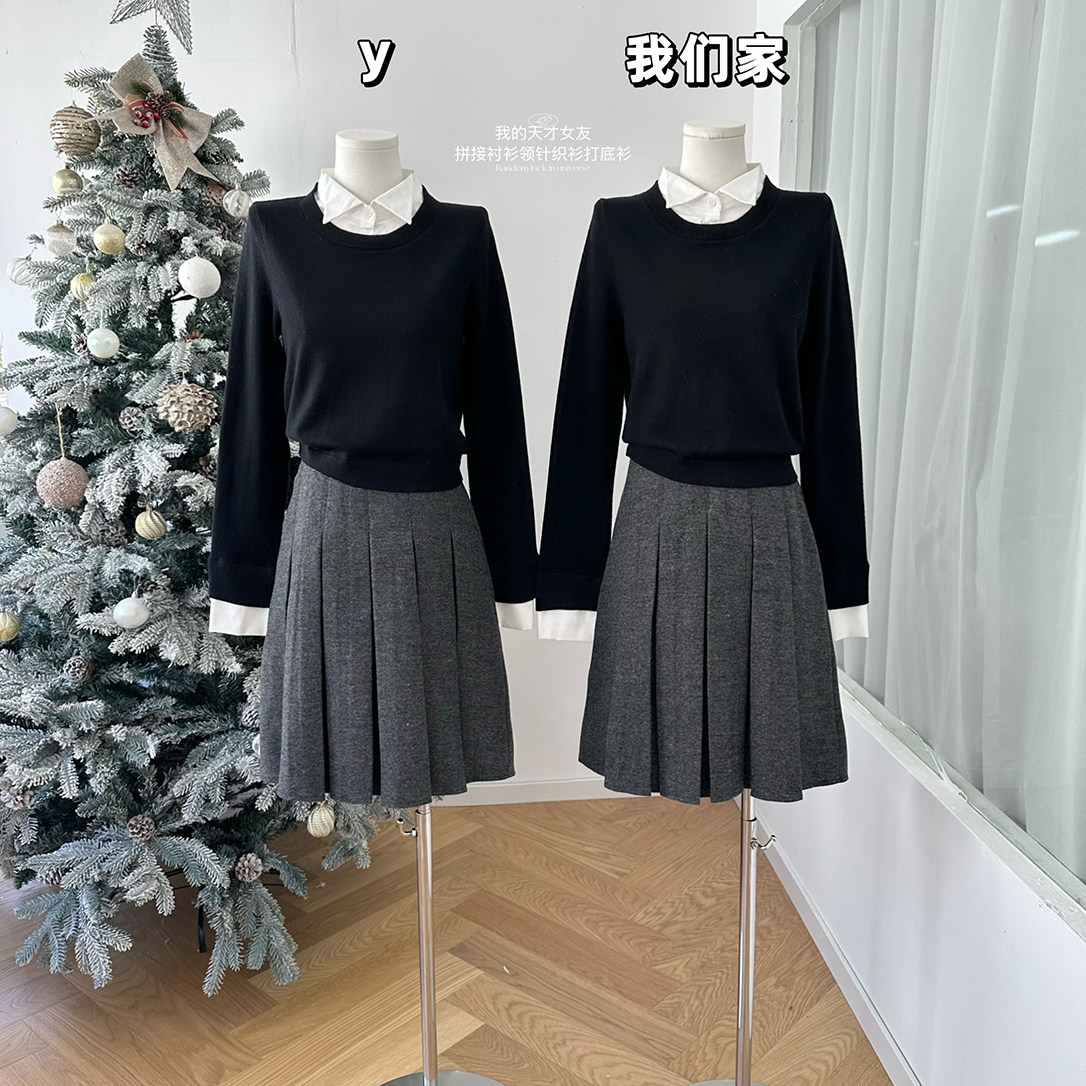 Lin12-我的天才女友 拼接衬衫领针织衫毛衣打底衫假两件套头上衣