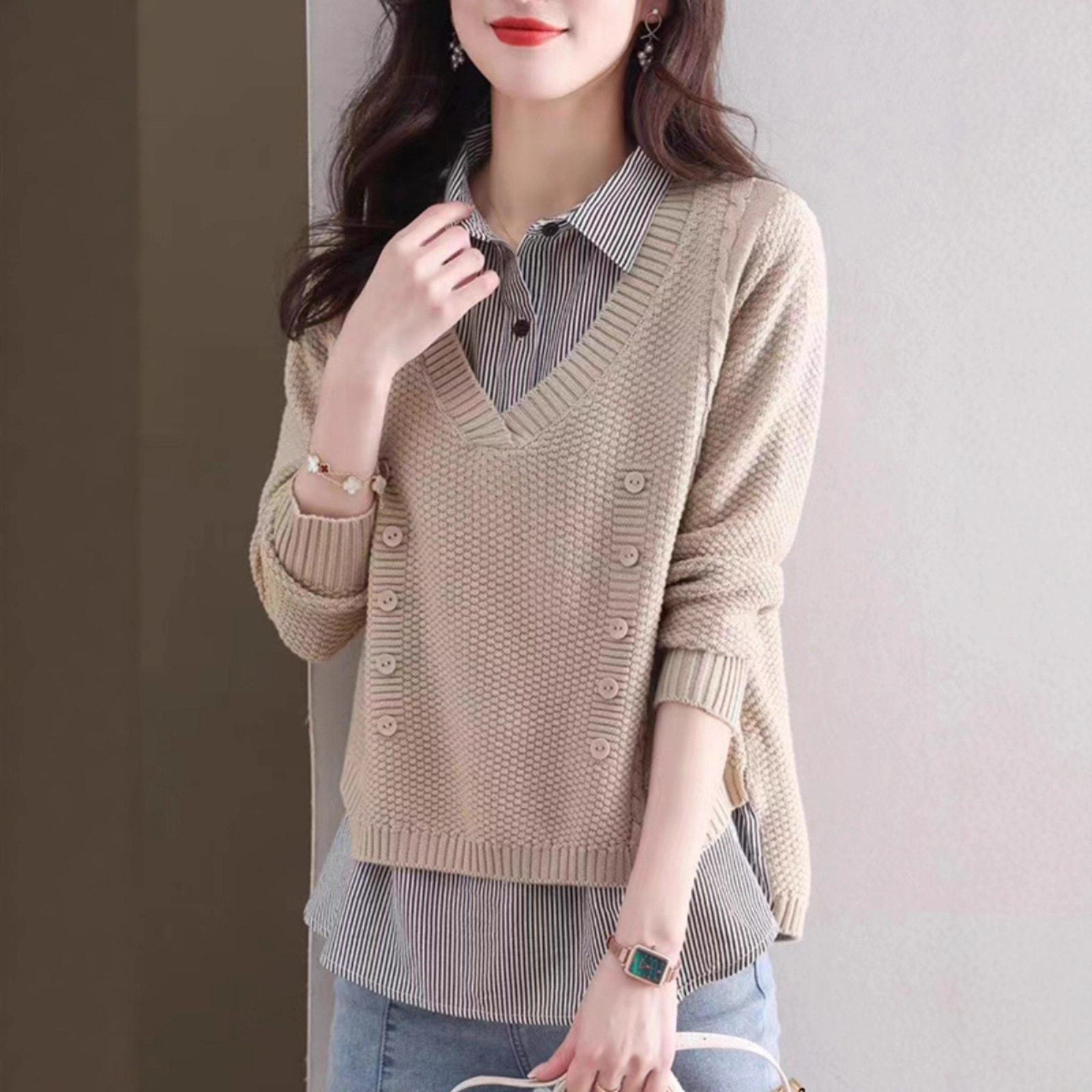 恋小维2025假两件针织衫V领拼衬衫领宽松显瘦套头毛衣女秋冬