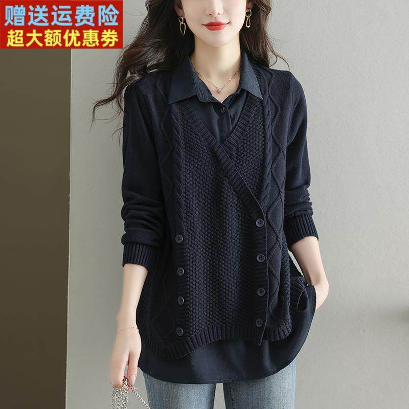 针织衫假两件套女衬衫领春秋装外穿中长款打底衫宽松套头毛衣外套