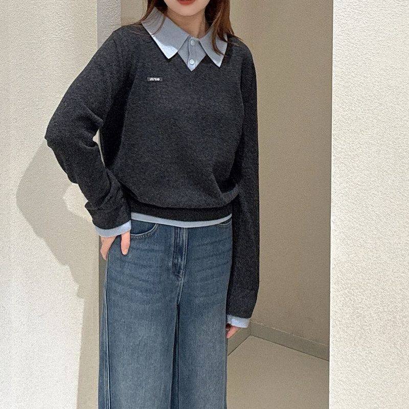 拼接牛仔布衬衫领假两件毛衣女2025春装新款宽松套头针织衫长袖女