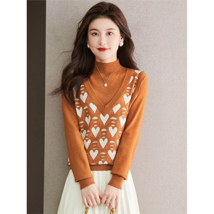 半高领假两件套头毛衣女士短2025新宽松内风格时尚针织羊毛底衬衫