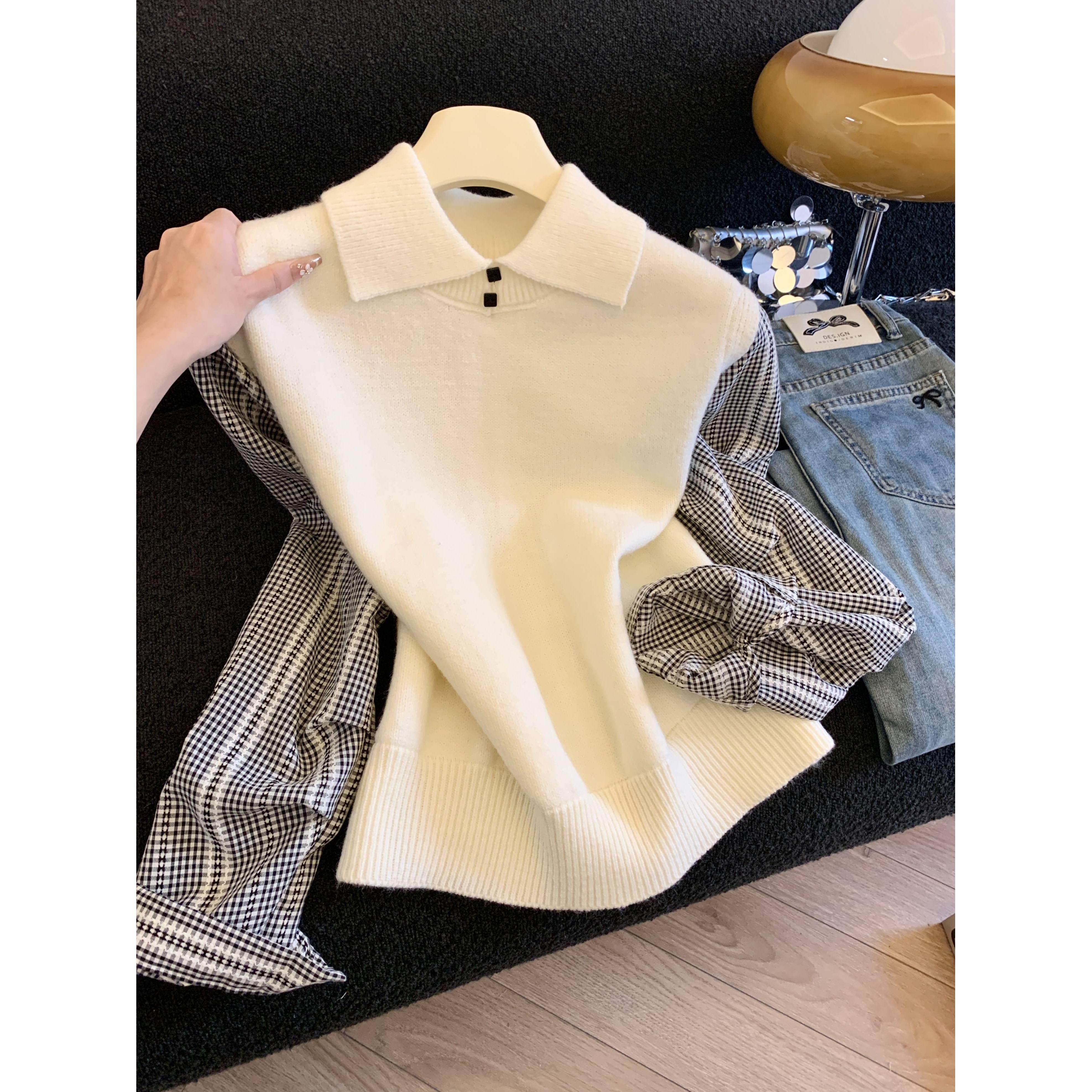 假两件针织衫女秋装新款百搭小众洋气宽松内搭上衣衬衫领套头毛衣