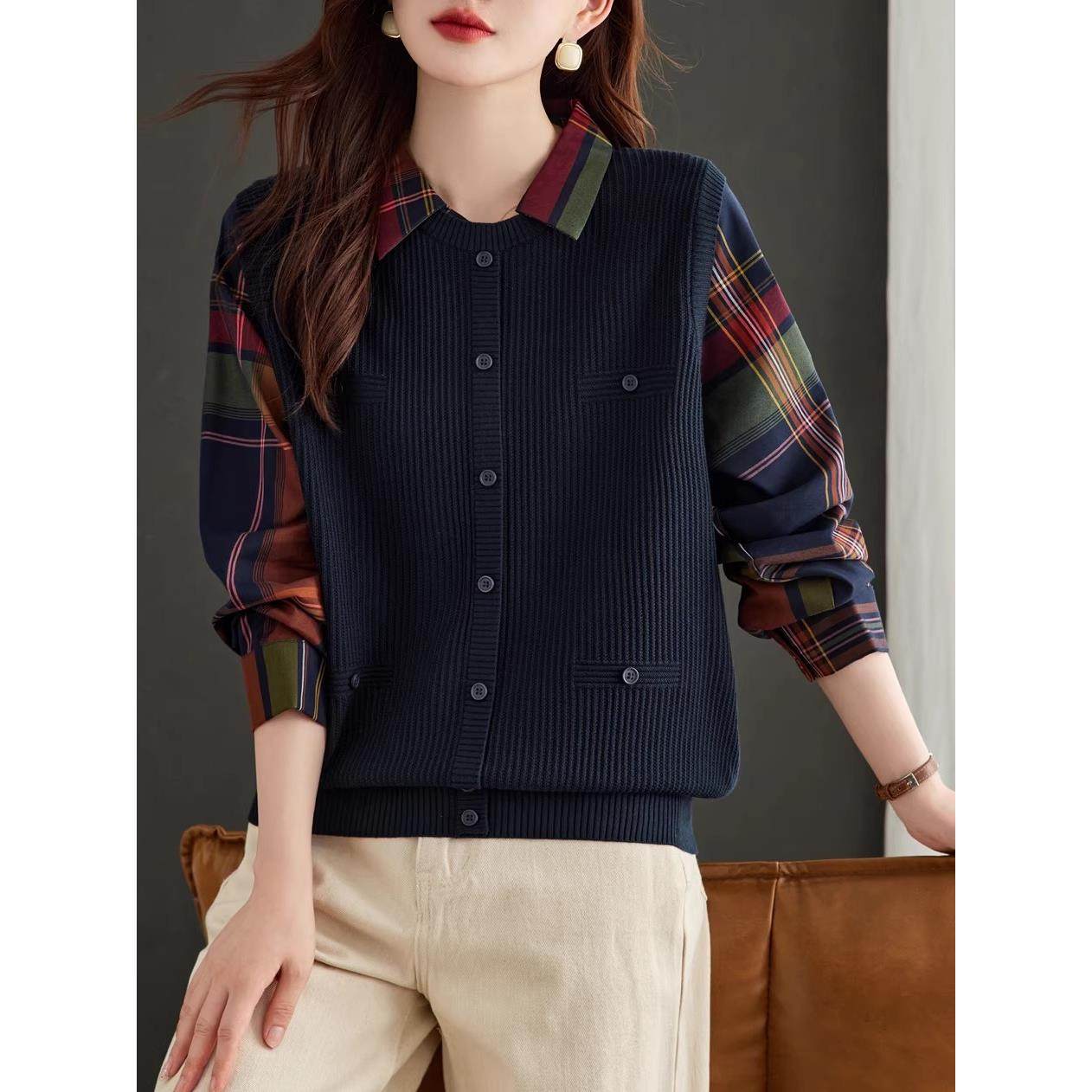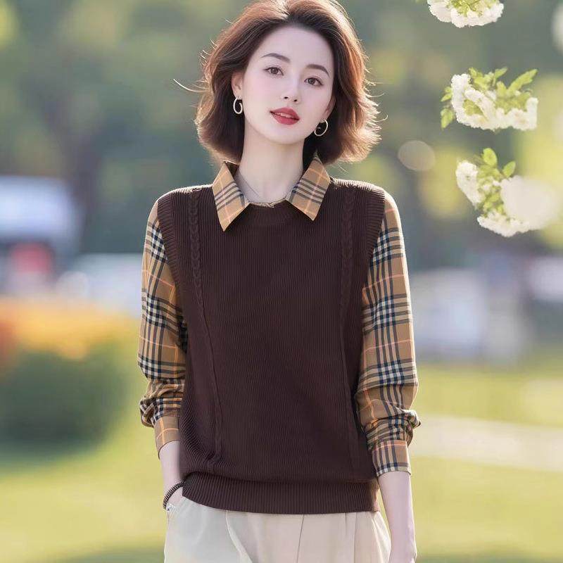 2025新款拼接衬衫领针织衫毛衣秋冬季打底衫假两件百搭上衣套头女