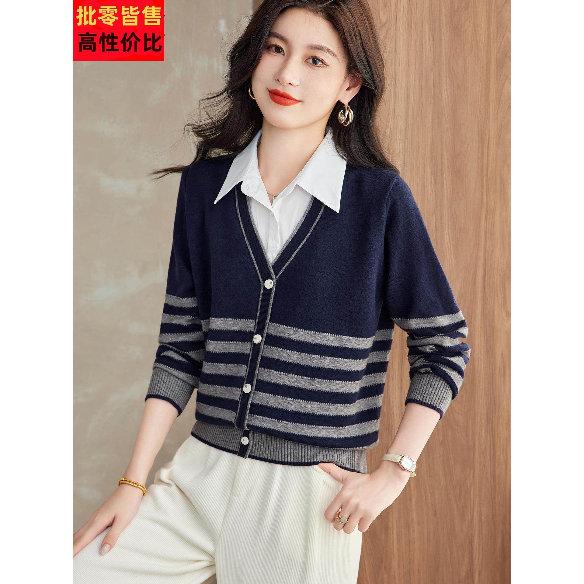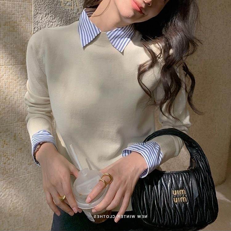 2023新款拼接衬衫领针织衫毛衣秋冬季打底衫假两件羊毛上衣套头女
