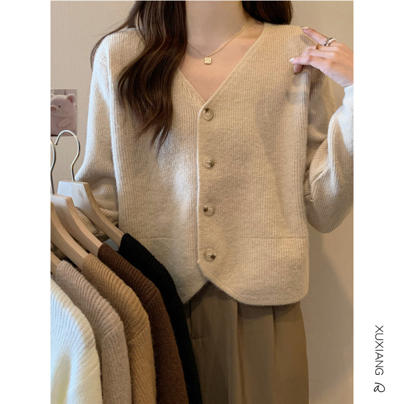 女士针织开衫春秋款外穿时尚洋气V领纯色修身短款百搭毛衣小外套