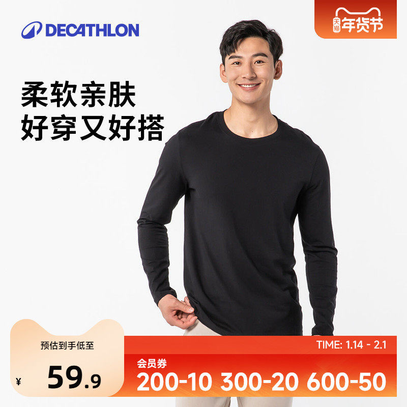 迪卡侬长袖T恤男秋冬保暖纯棉纯色上衣打底衫白大码卫衣体恤SAT3