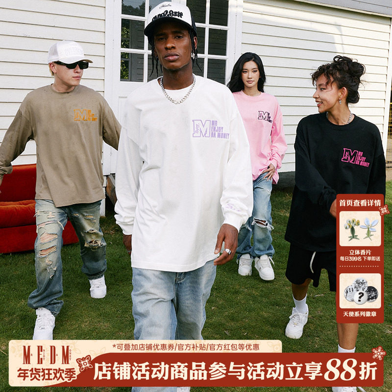 MEDM国潮秋季刺绣多色长袖T恤男oversize体恤衫宽松休闲百搭上衣