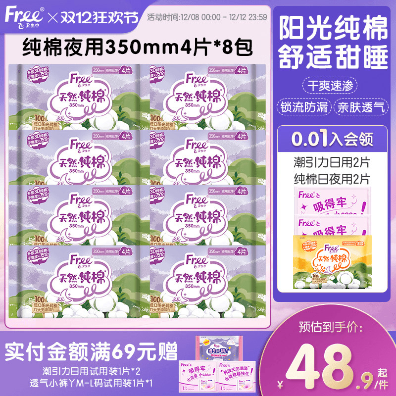 free阳光纯棉夜用卫生巾加长日夜用透气亲肤350mm8包旗舰店