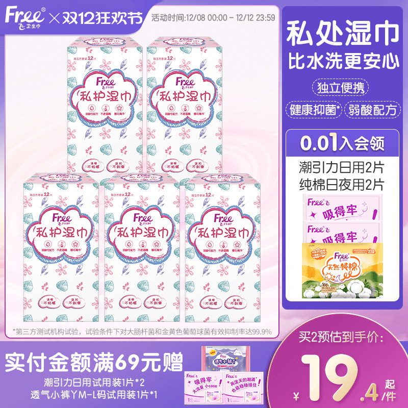 Free飞私处卫生湿巾私护女性湿纸巾洁阴护理抑菌清洁【官方正品】