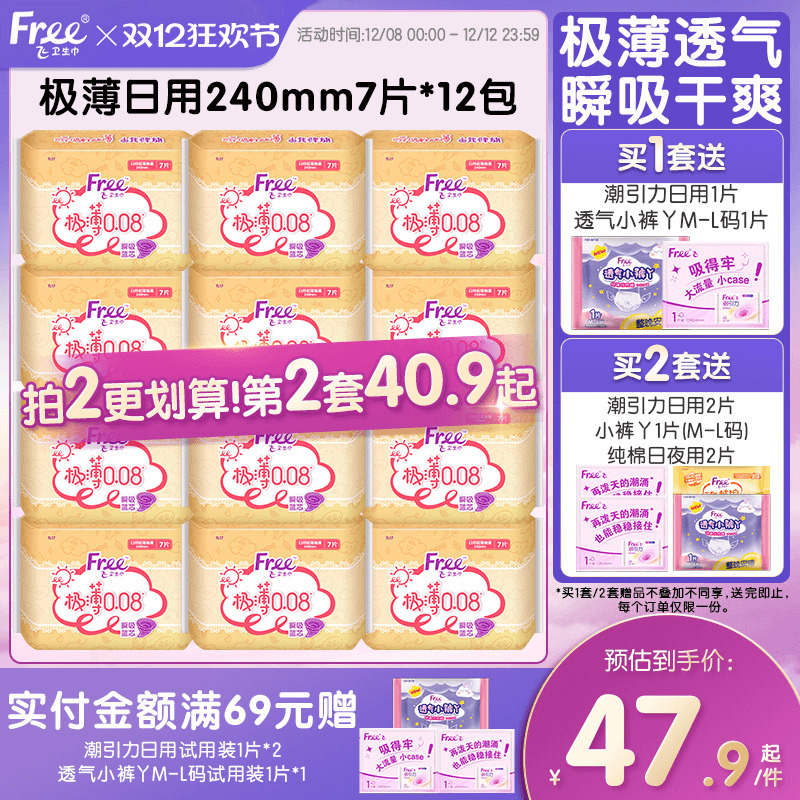 Free极薄卫生巾超薄透气干爽少女日用卫生巾官方正品7片*12包