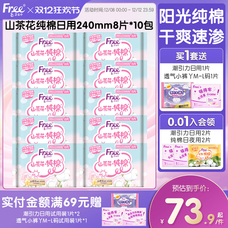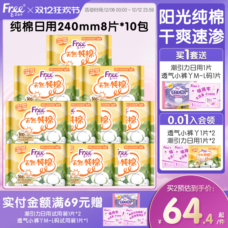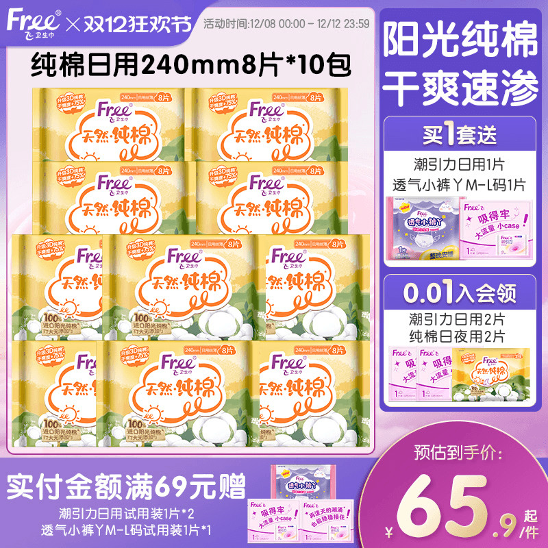 free飞纯棉日用卫生巾纯棉10包囤货组合装80片正品旗舰店