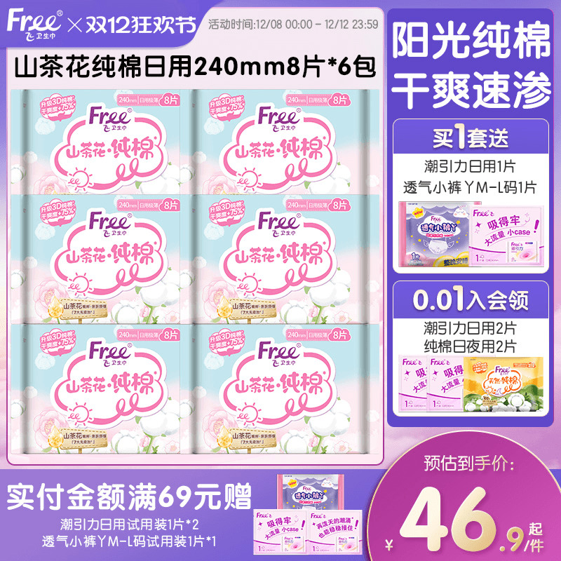 Free飞纯棉卫生巾240mm日用纯棉组合装6包官方正品呵护敏感肌护垫