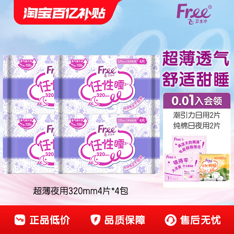 【优于新国标】Free卫生巾超薄透气夜用320mm4包姨妈巾官方正品