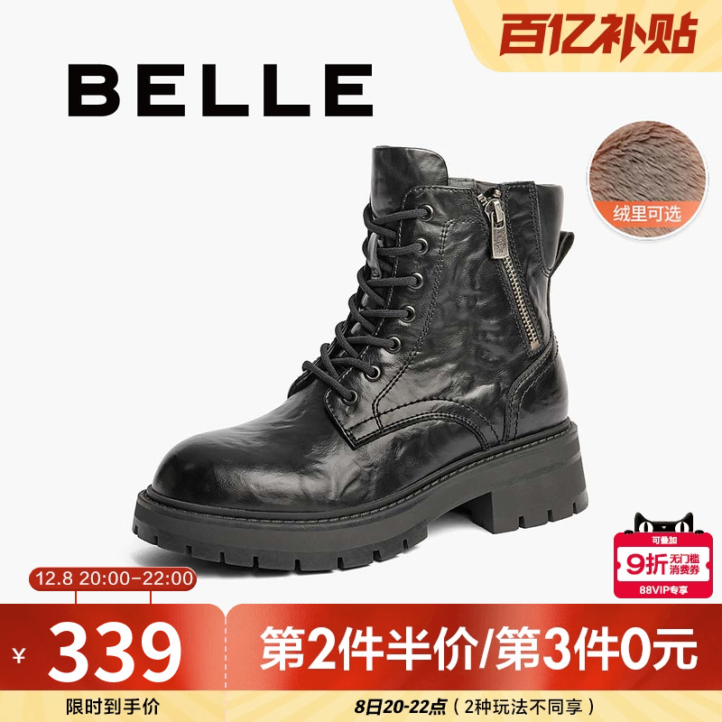 百丽靴子英伦风马丁靴女冬新款厚底皱皮复古加绒保暖短靴B9N1DDD4
