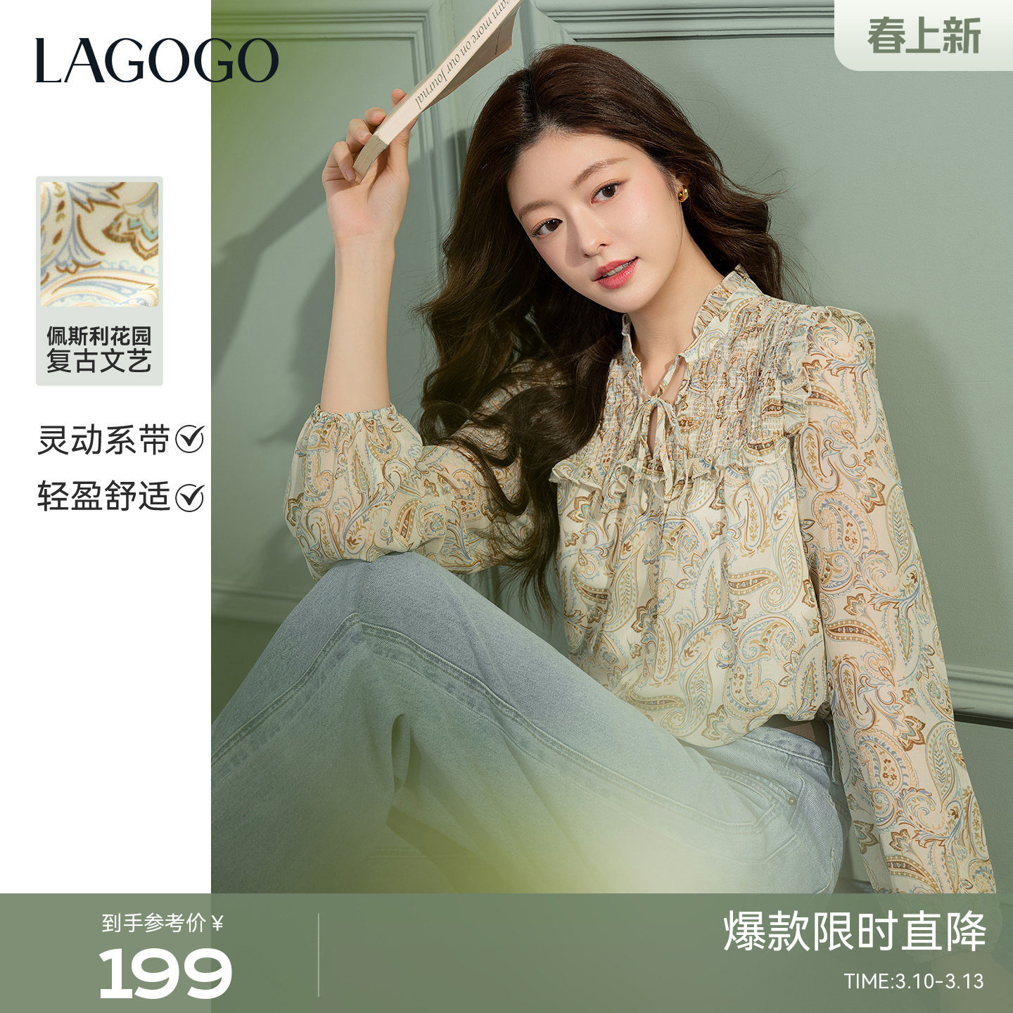 LAGOGO复古碎花雪纺衫女拉谷谷2026春新款优雅木耳边长袖衬衫上衣