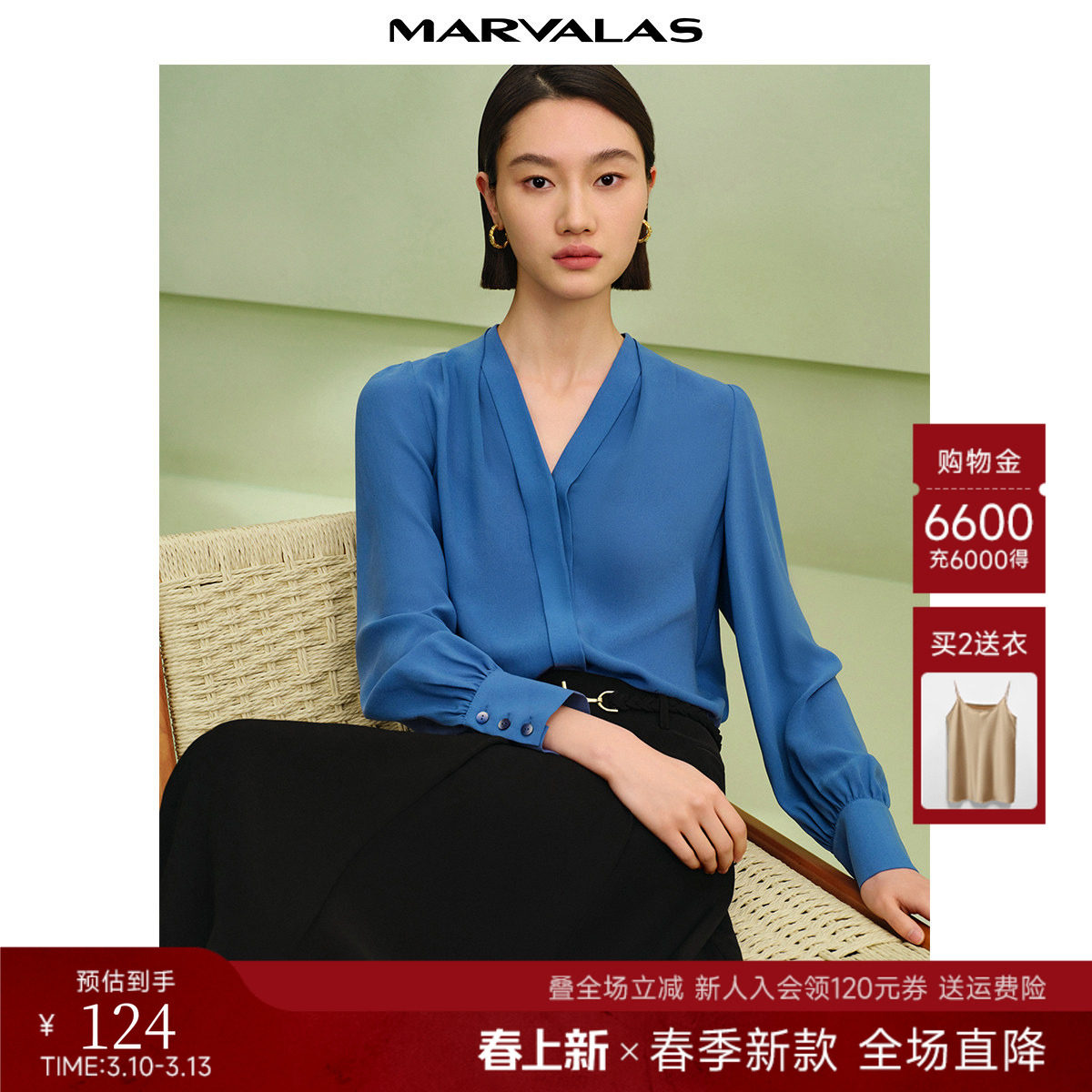 曼德诗醋酸雪纺衬衫2026夏季新款纯色克莱因蓝上衣设计感V领衬衣