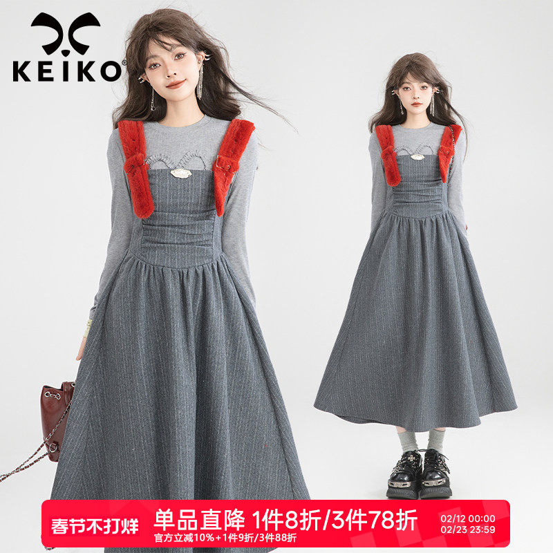 KEIKO 法式打揽薄毛呢背带连衣裙春季撞色肩带显瘦A字吊带长裙子