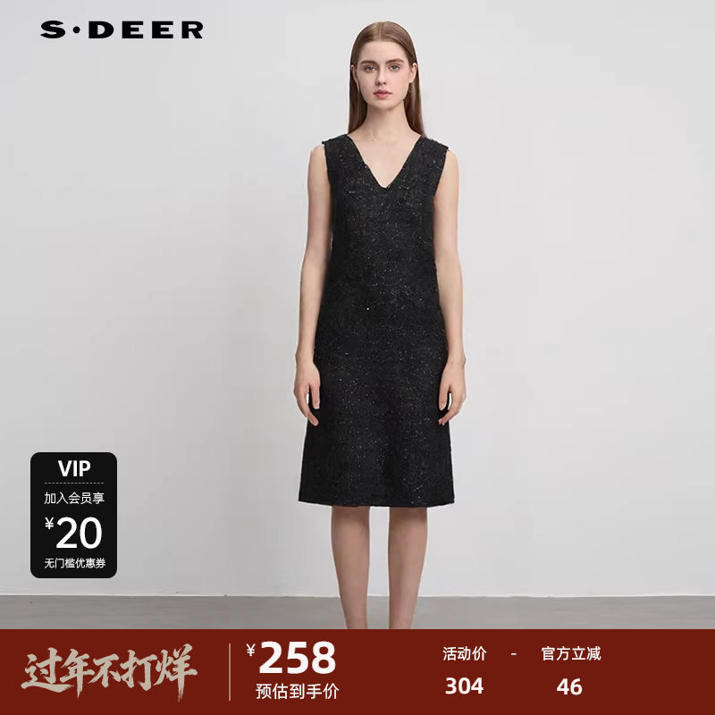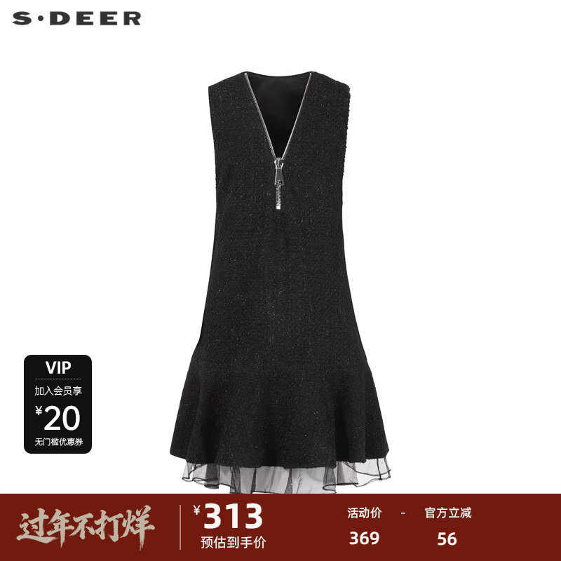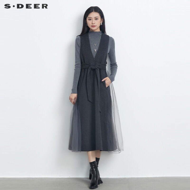 sdeer圣迪奥女装V领收腰网纱毛呢背带连衣裙S23481204