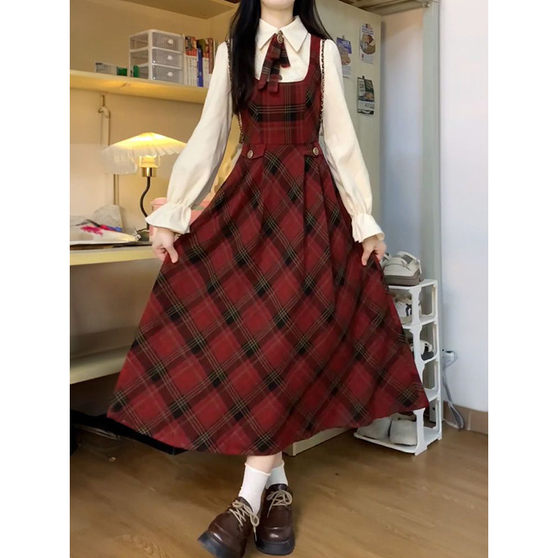 甜美小个子学院风红格纹毛呢背带连衣裙女搭配杏色长袖衬衫送领结