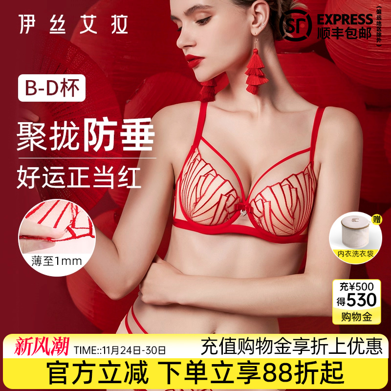 伊丝艾拉性感超薄款透明文胸法式性感蕾丝红色新娘内衣内裤套装女