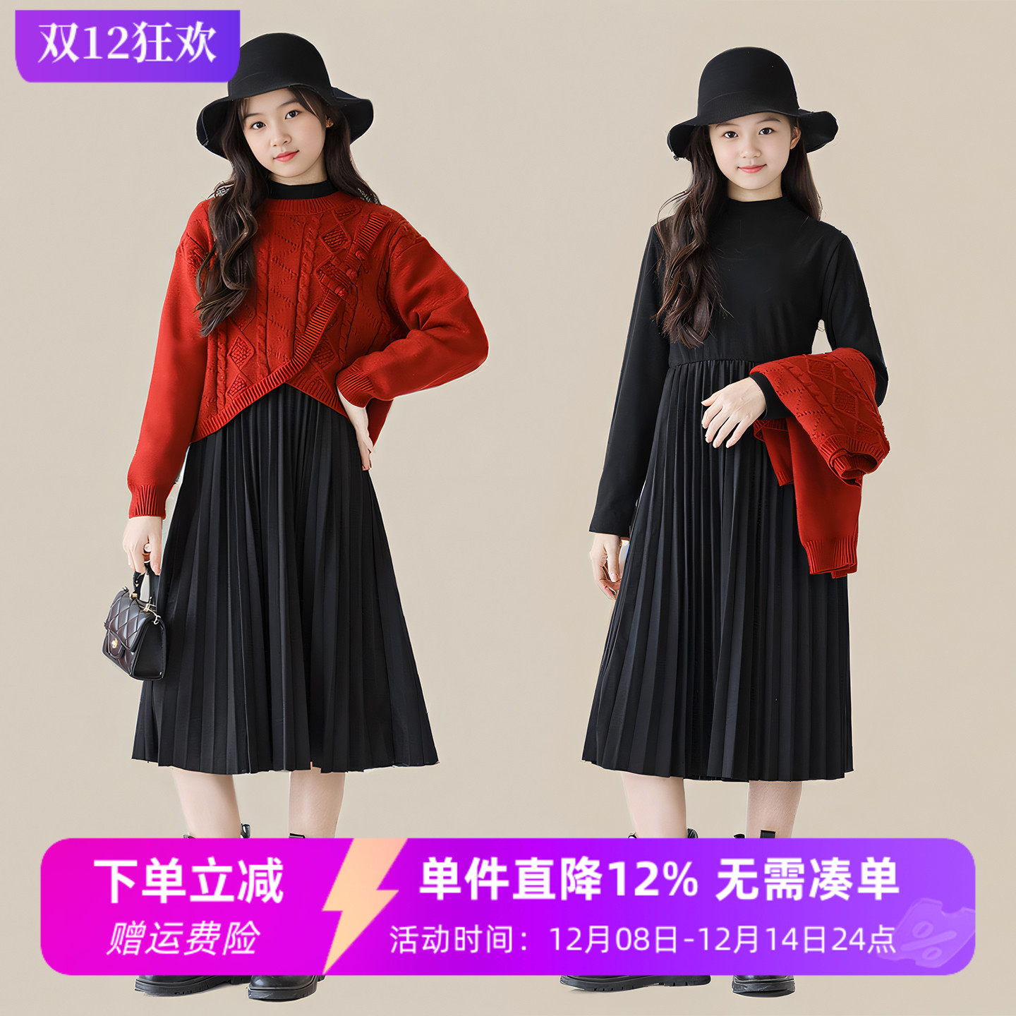 女童洋气连衣裙套装冬装新款儿童红色拜年服国风毛衣百褶裙两件套