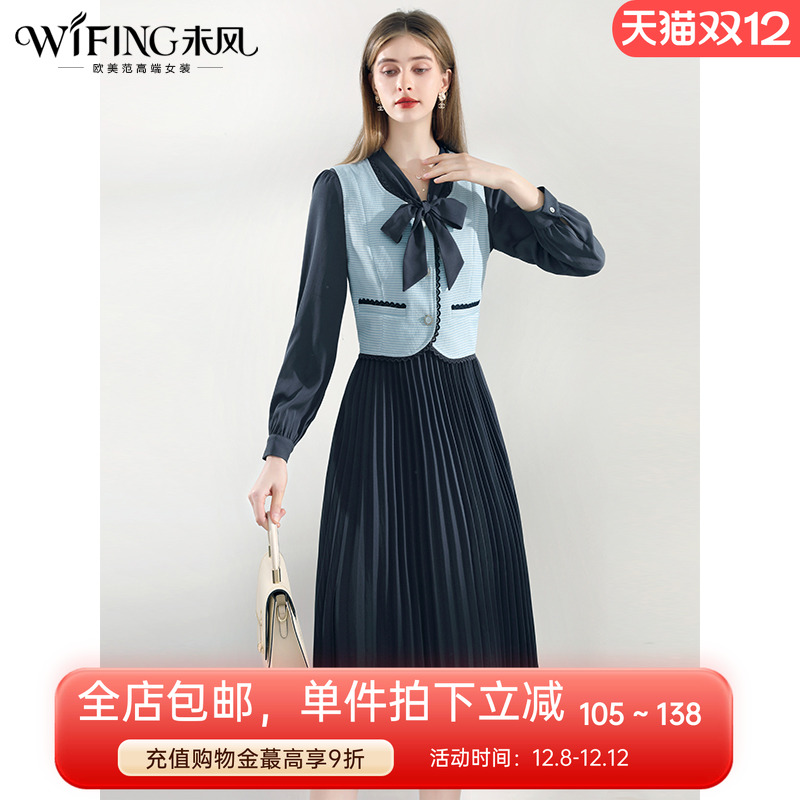 未风蓝色连衣裙女秋2025秋装新款女装气质小香风百褶裙子两件套装