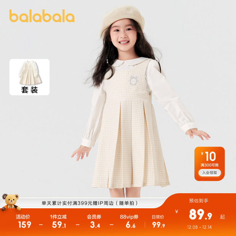 巴拉巴拉童装儿童连衣裙子套装女童秋装衬衣百褶两件套洋气千鸟格