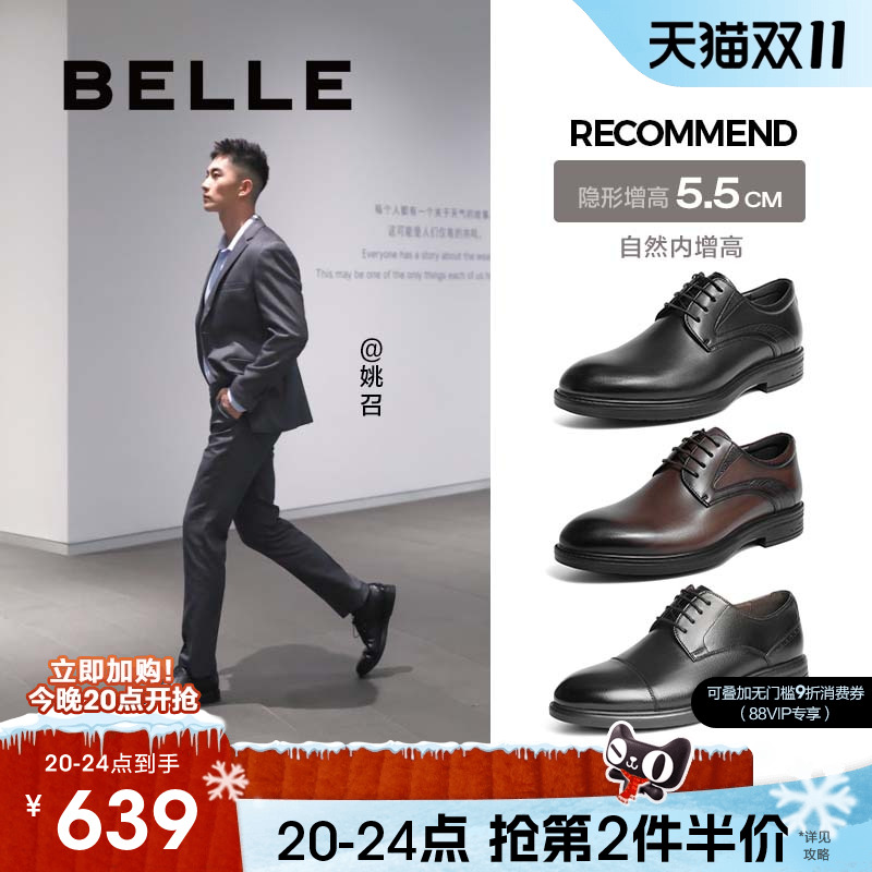 百丽男士商务正装皮鞋秋季新款黑色德比真皮增高新郎婚鞋A1208CM3