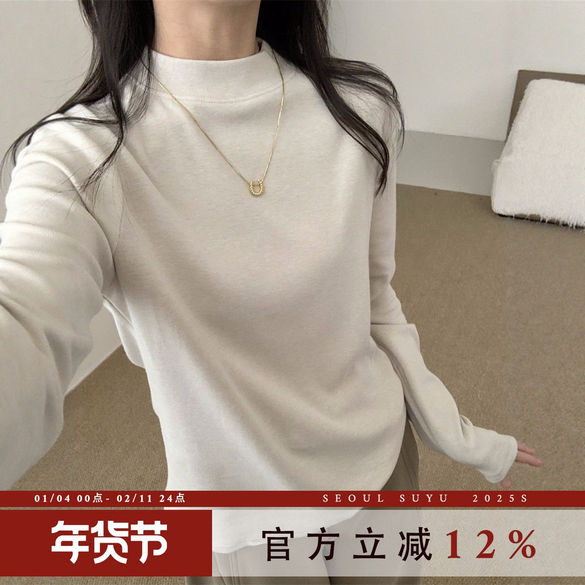 欧货半高领打底衫女2025秋冬正肩纯色内搭螺纹加绒百搭磨毛上衣潮
