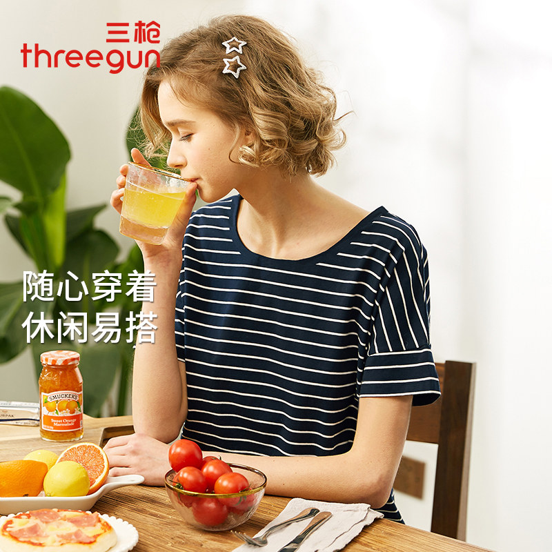 三枪T恤夏季彩条爽滑密棉条纹宽松女衫休闲圆领连袖上衣短袖汗衫