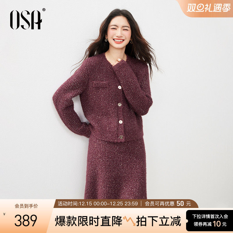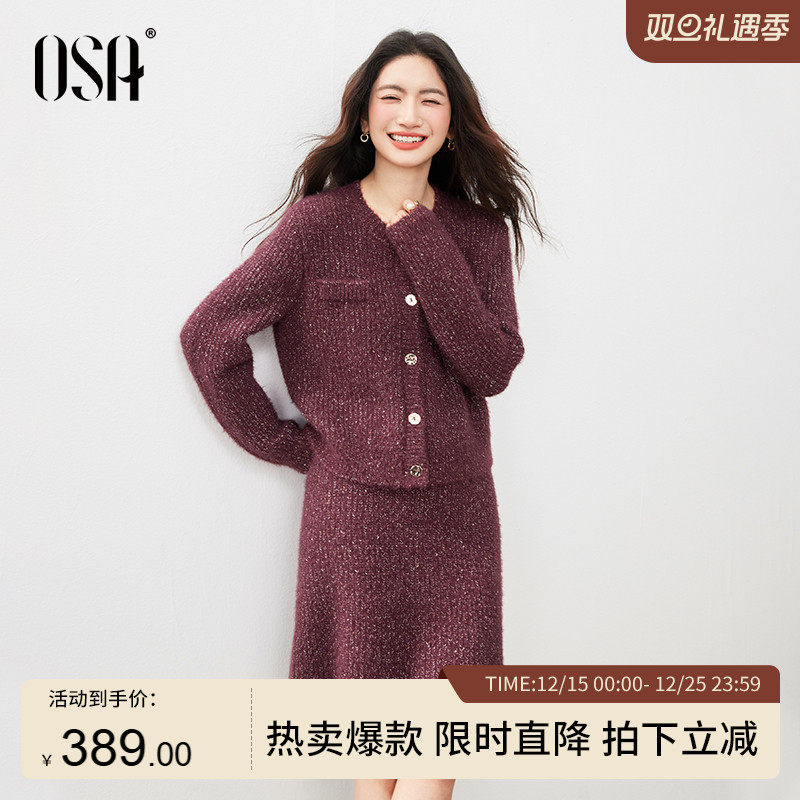 OSA欧莎小香风针织套装女冬新款气质显瘦开衫+半裙两件套时尚套装