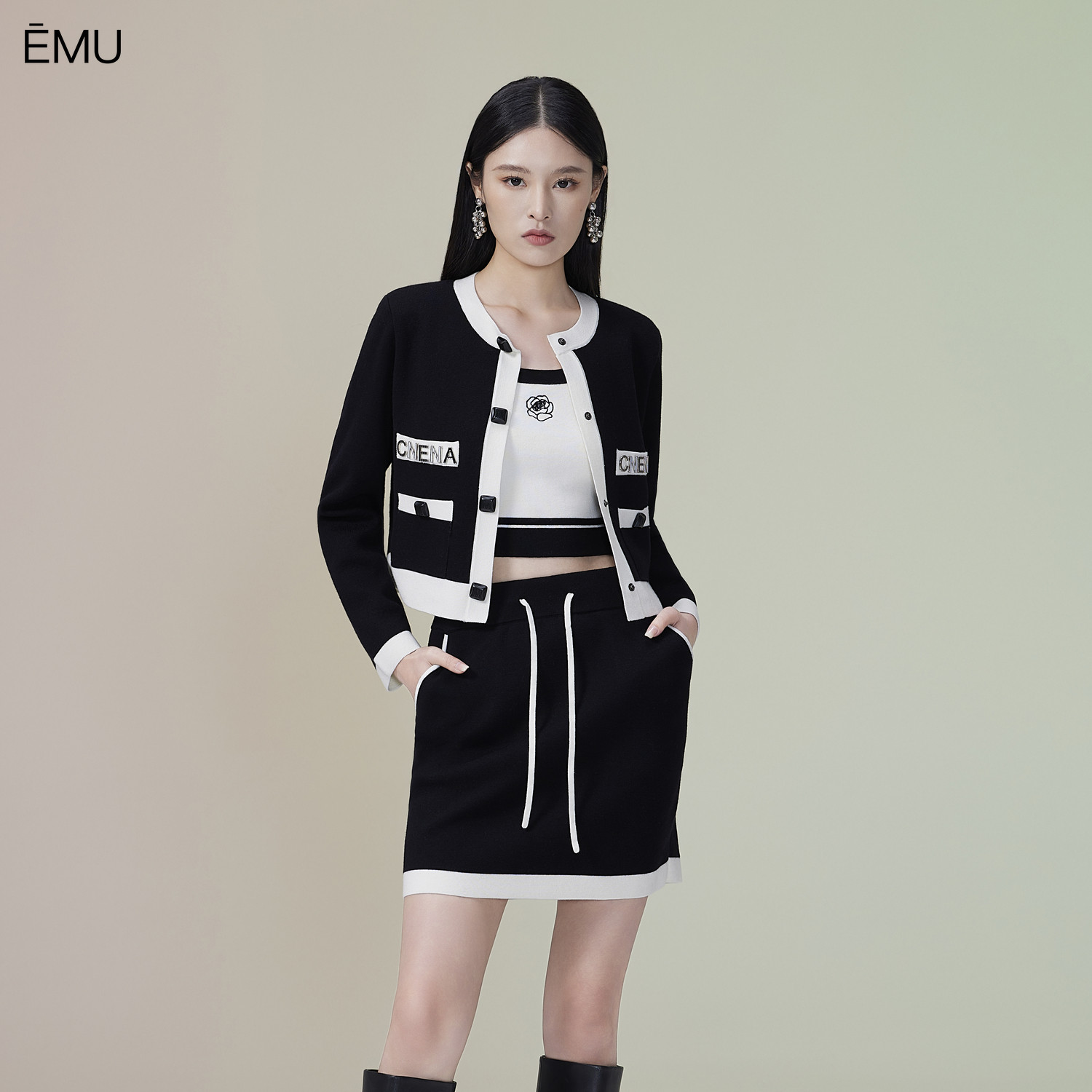 依妙EMU气质小香风针织套装女2025秋款黑白撞色毛织外套短裙