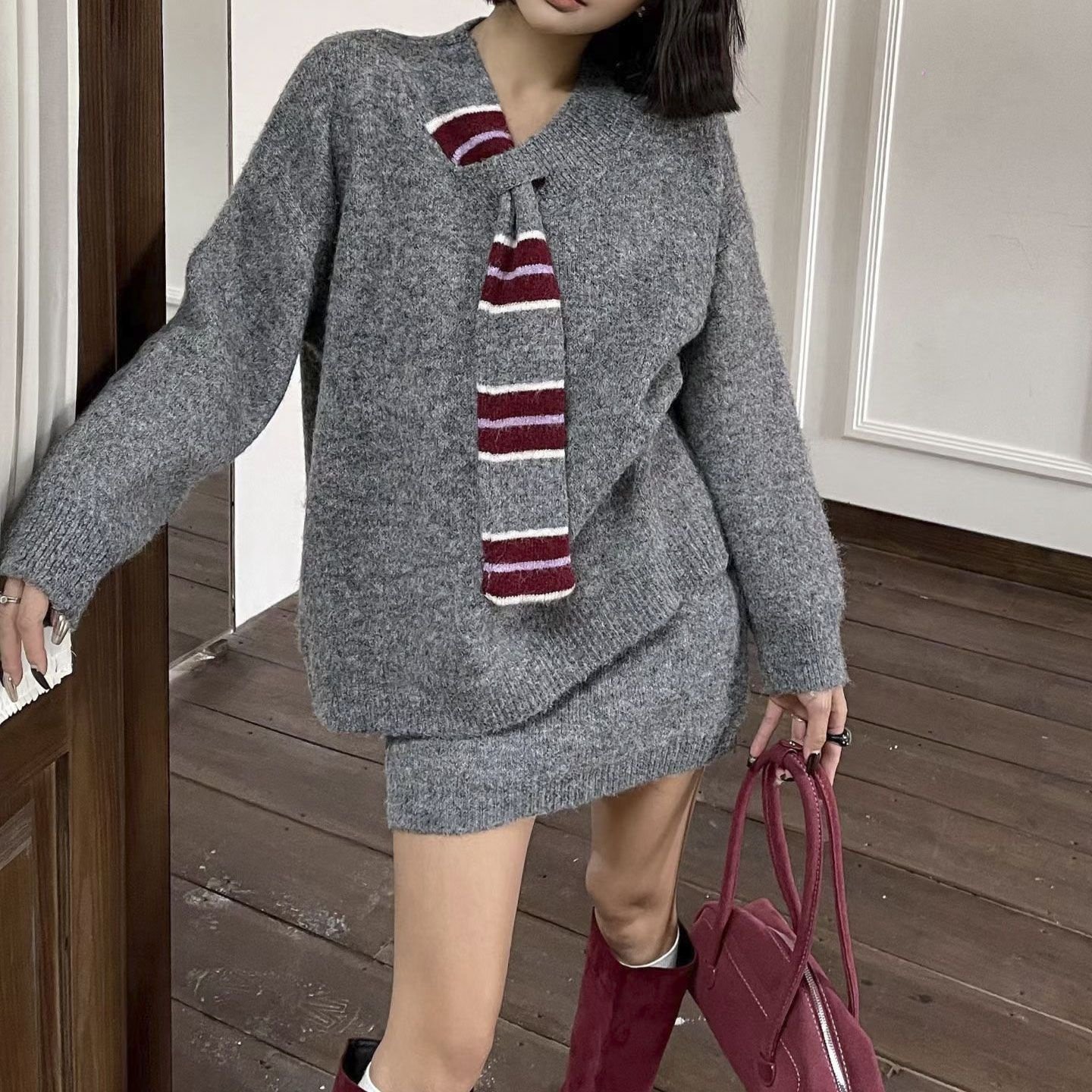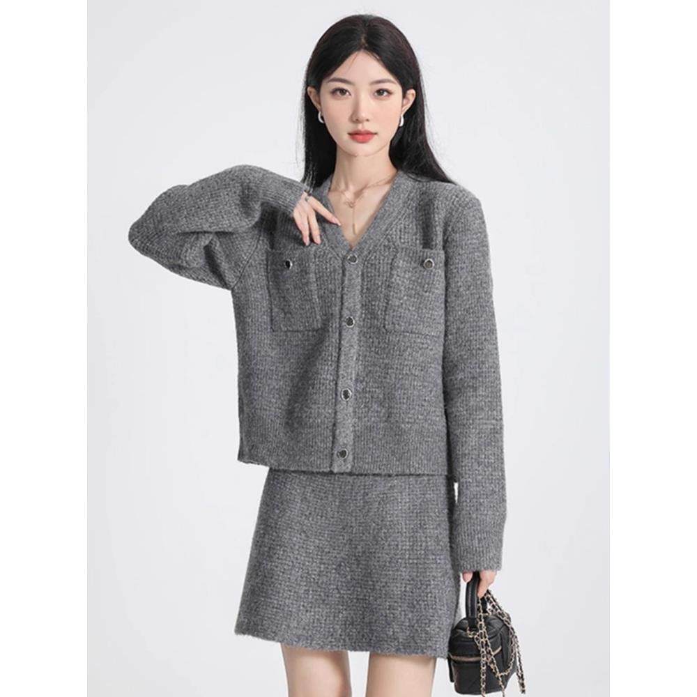 Mere Kore灰色V领小香风针织套装裙女秋冬新款减龄气质显瘦两件套