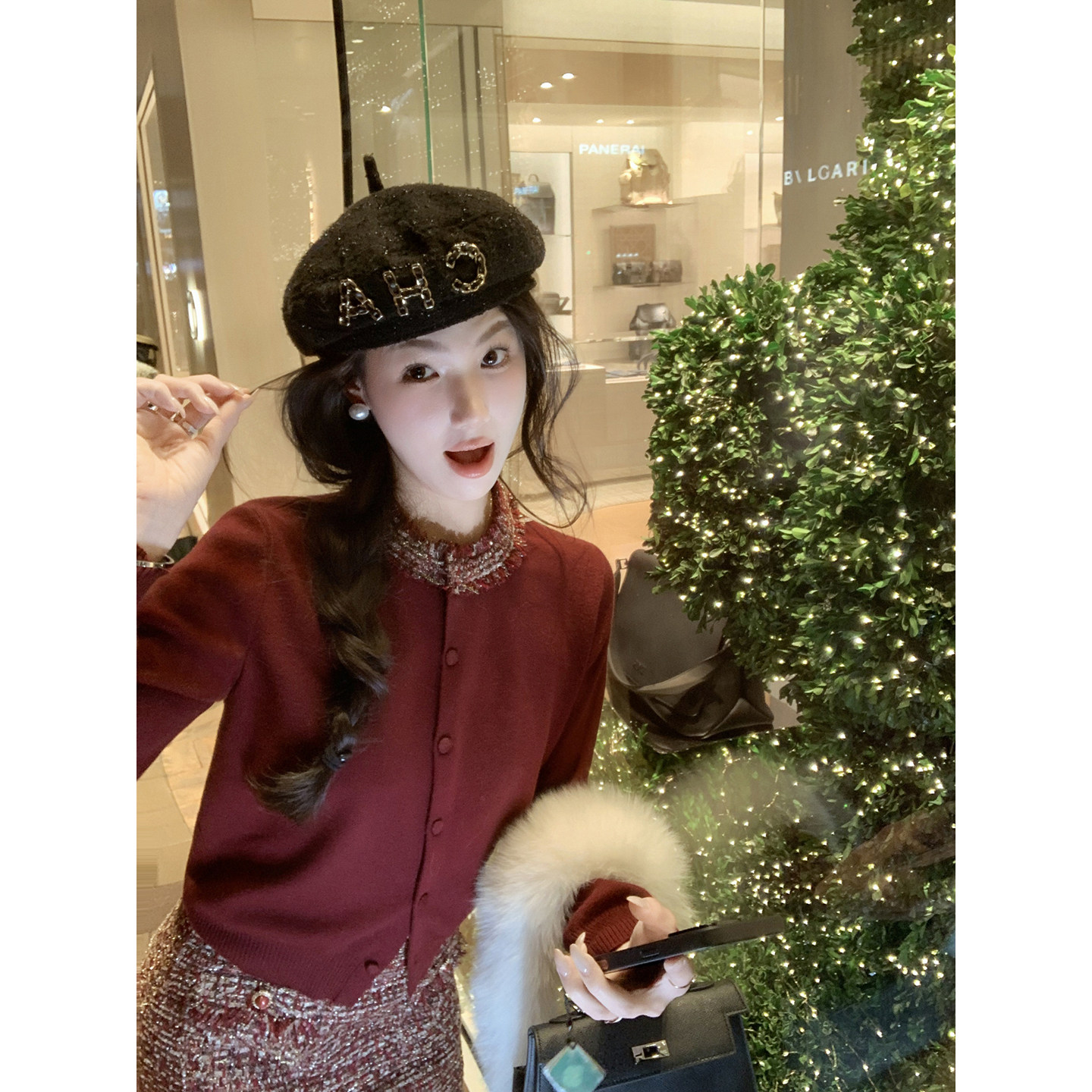 CHICHY经典款红色小香风针织套装女秋季款显瘦开衫半身长裙两件套