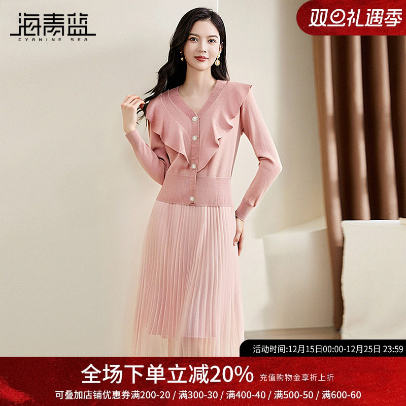 海青蓝2024新款小香风针织套装女秋季针织开衫+网纱半身裙两件套