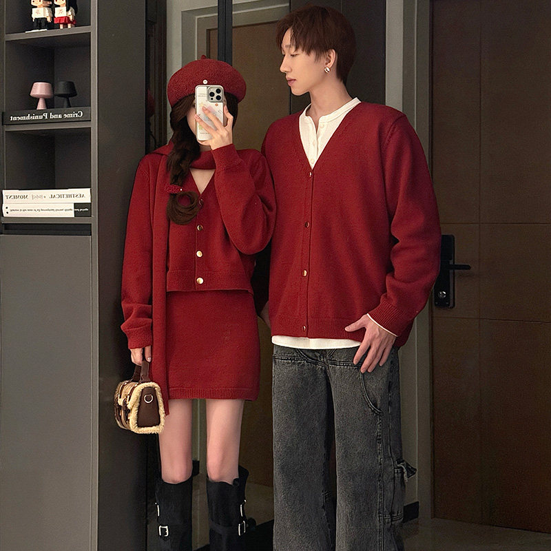 情侣装2025秋冬设计感小香风针织套装圣诞红色毛衣氛围感跨年穿搭