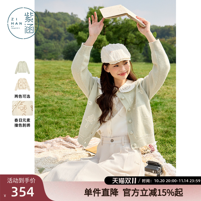 紫涵刺绣圆领针织开衫女春秋季新款甜美设计感宽松休闲毛衣外套潮