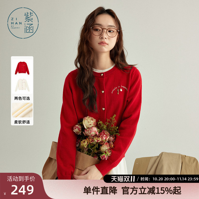 紫涵圆领刺绣针织开衫女春秋季撞色纽扣宽松休闲红色上衣打底开衫