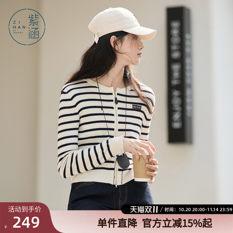 紫涵撞色条纹圆领针织开衫女春秋季新款宽松显瘦休闲百搭针织外套